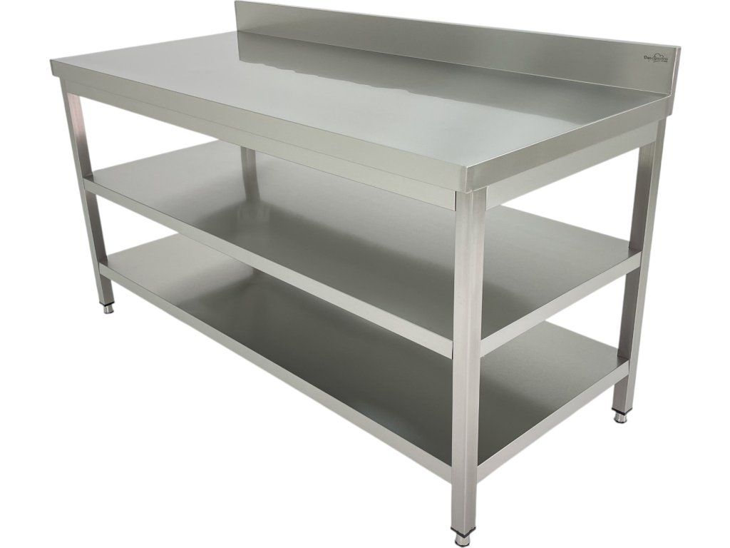Nerezový pracovní stůl PREMIUM se dvěma policemi a zadním lemem 2,0 m