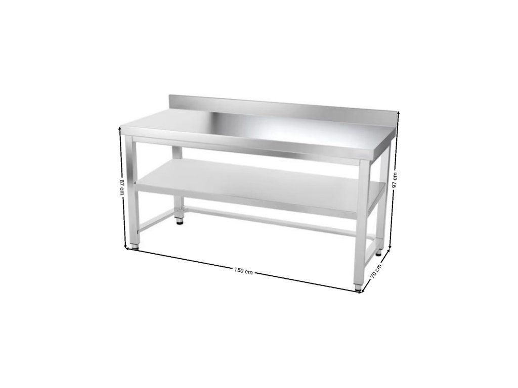 Nerezový pracovní stůl PREMIUM se spodní policí, zadním lemem a trnoží 1,5 m