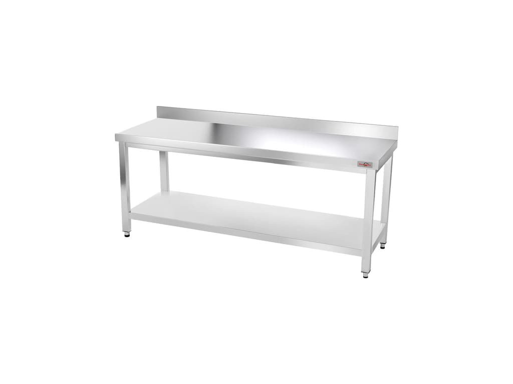 - Nerezový pracovní stůl se spodní policí a zadním lemem