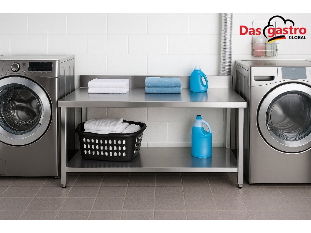 - Nerezový pracovní stůl se spodní policí a zadním lemem