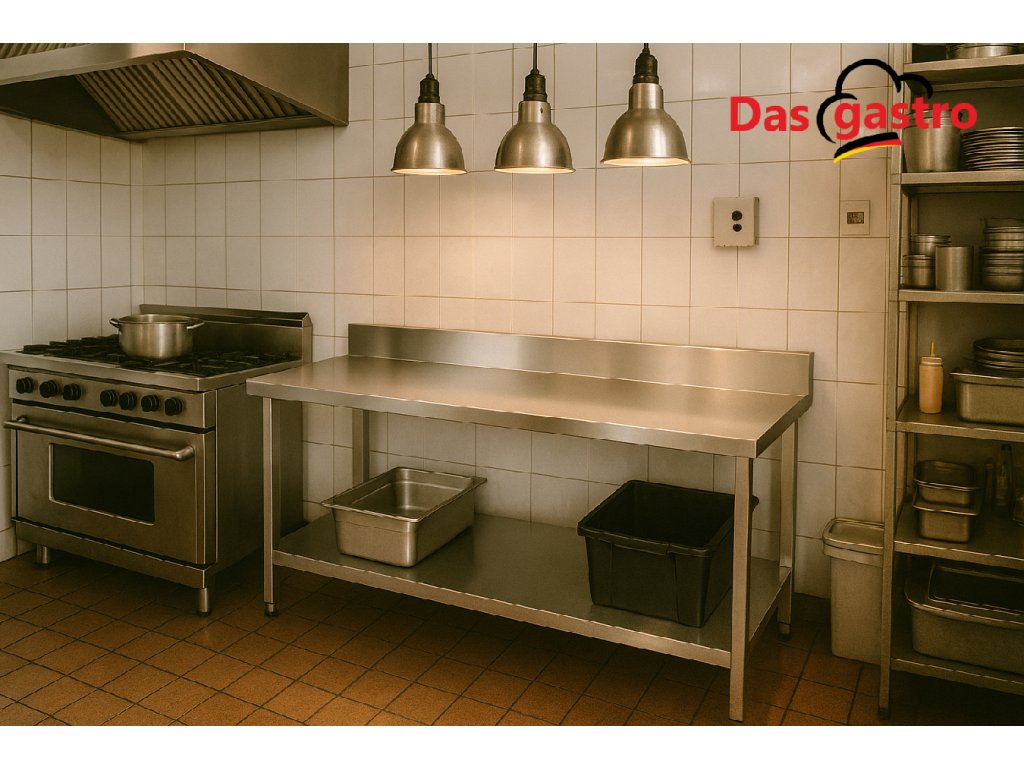 - Nerezový pracovní stůl se spodní policí a zadním lemem