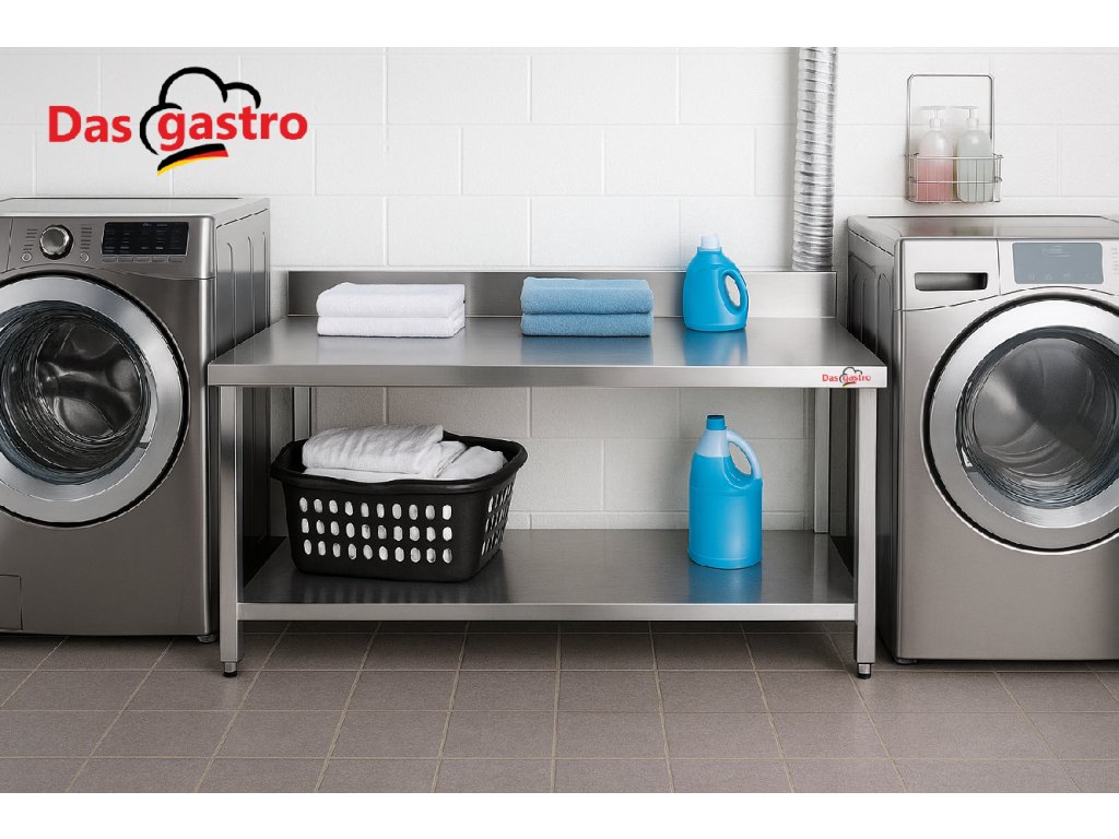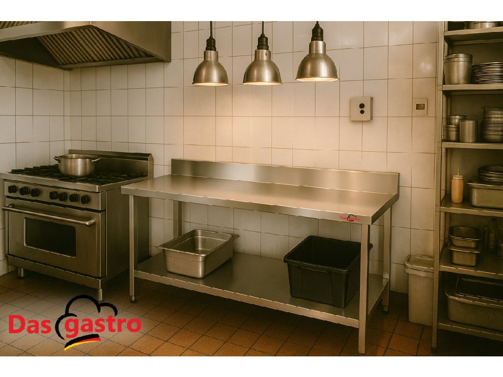- Nerezový pracovní stůl se spodní policí a zadním lemem