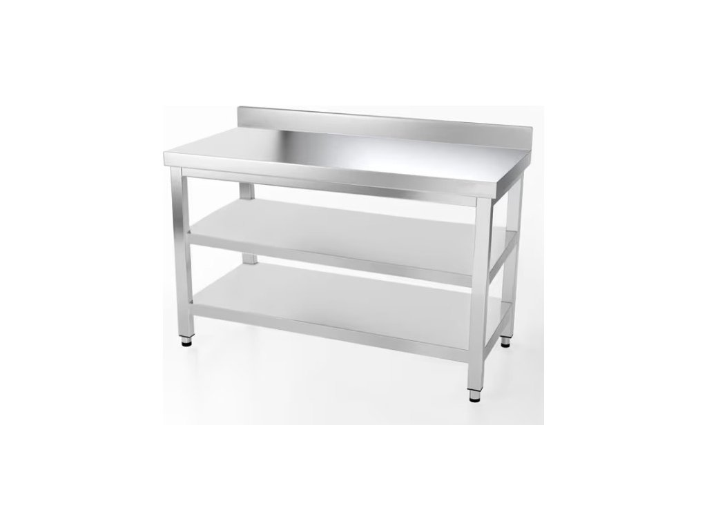 Nerezový pracovní stůl PREMIUM se spodní policí, zadním lemem a trnoží 1,4 m